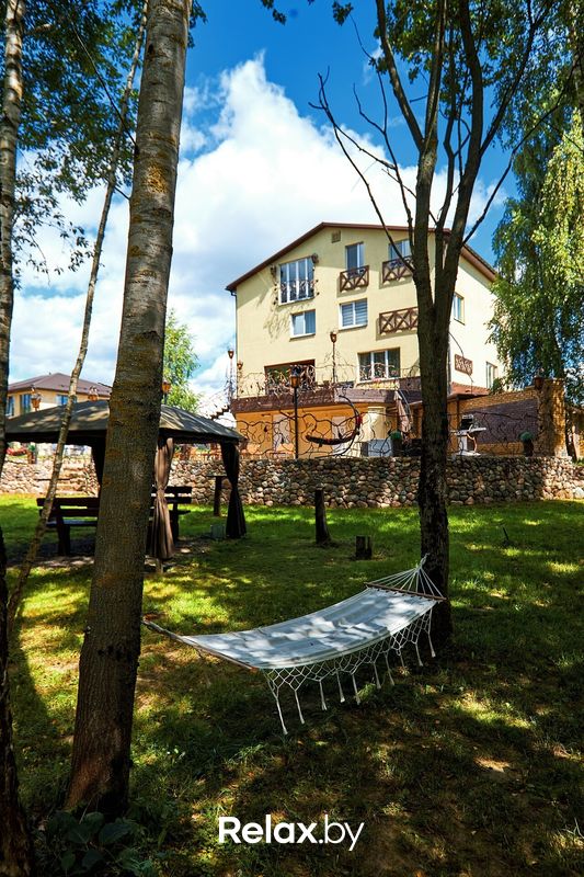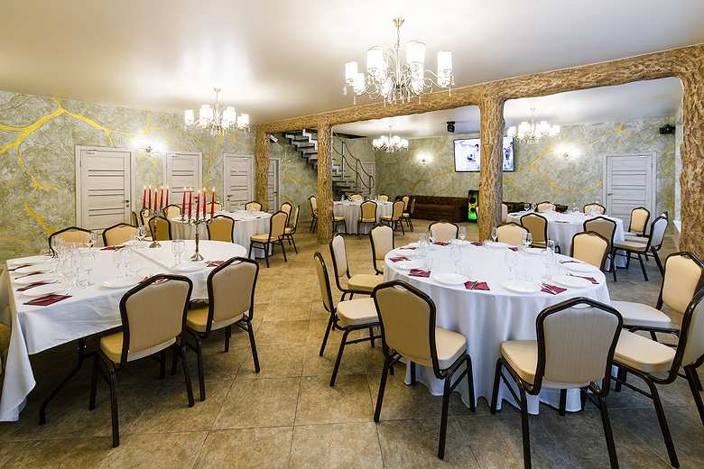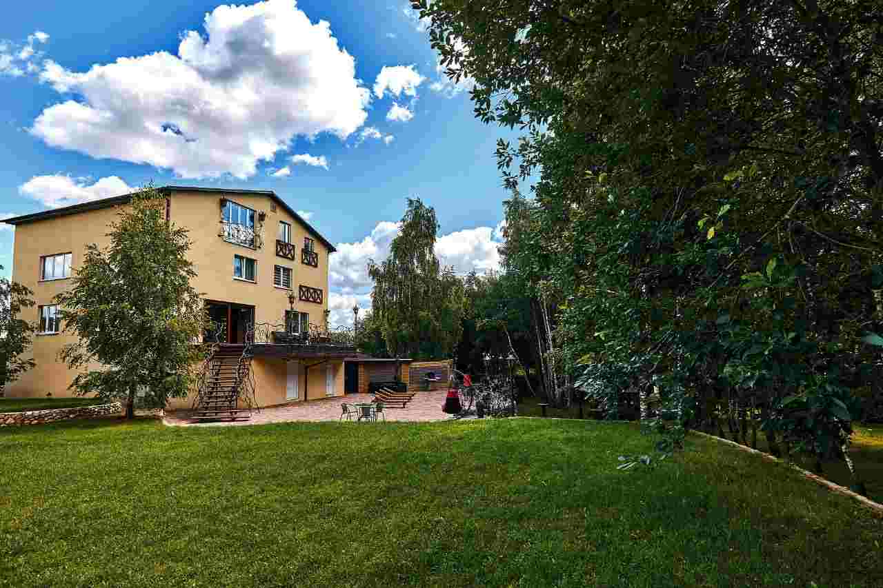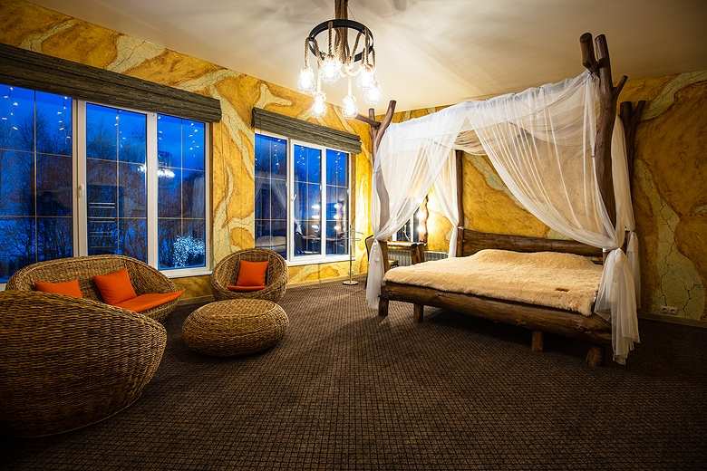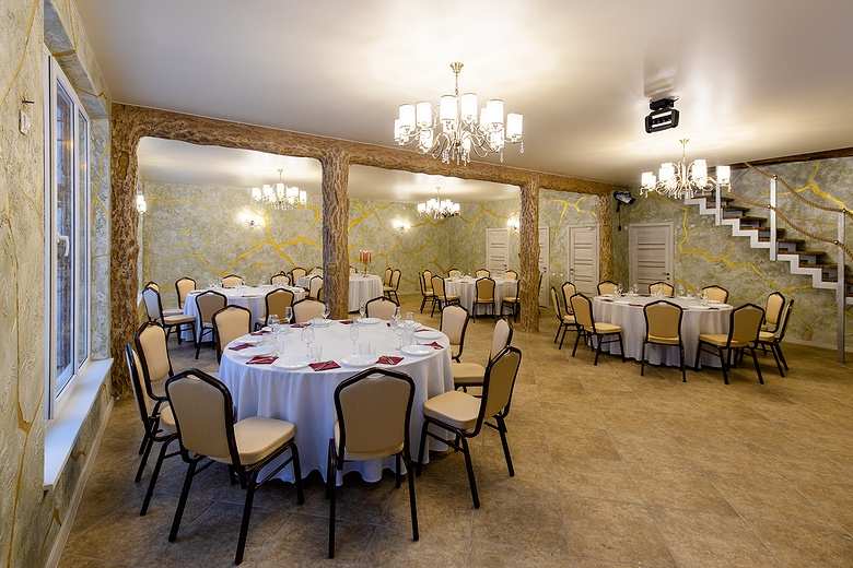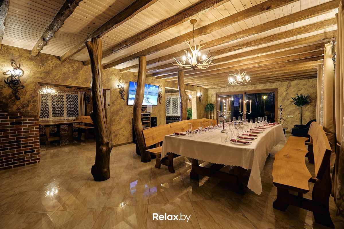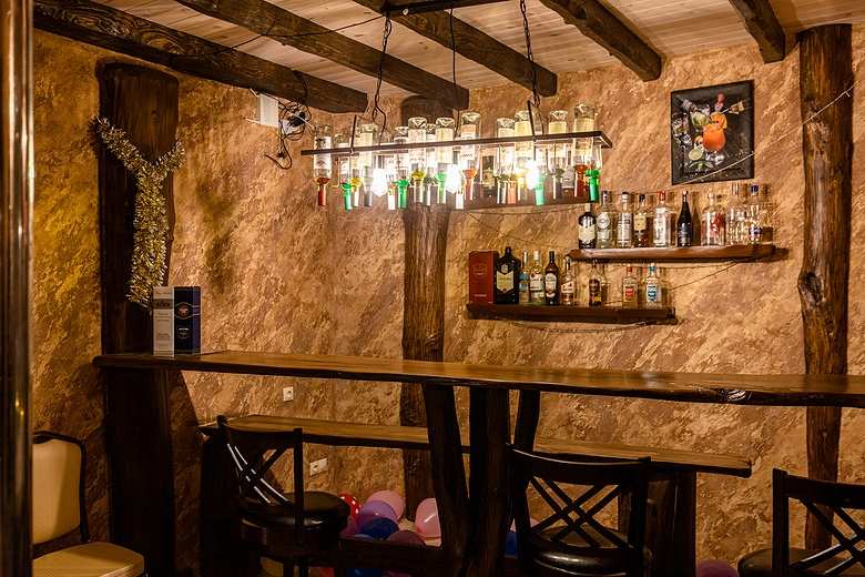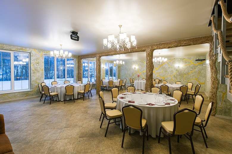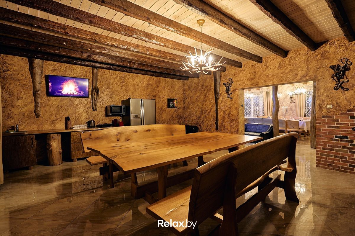 Внутри дома есть 5 комнаты отдыха с двуспальными кроватями и мебелью, чтобы комфортно разместиться на несколько дней. Только современная сантехника и бытовая техника кухни: все блага цивилизации доступны даже в загородной поездке. Из дома оборудован выход на террасу, которая легко превращается в дополнительное место для праздника. Тут можно оборудовать настоящий банкетный зал на свежем воздухе. Для мероприятий внутри дома предлагается 2 банкетных зала (20-50 чел.) с уникальными интерьерами.