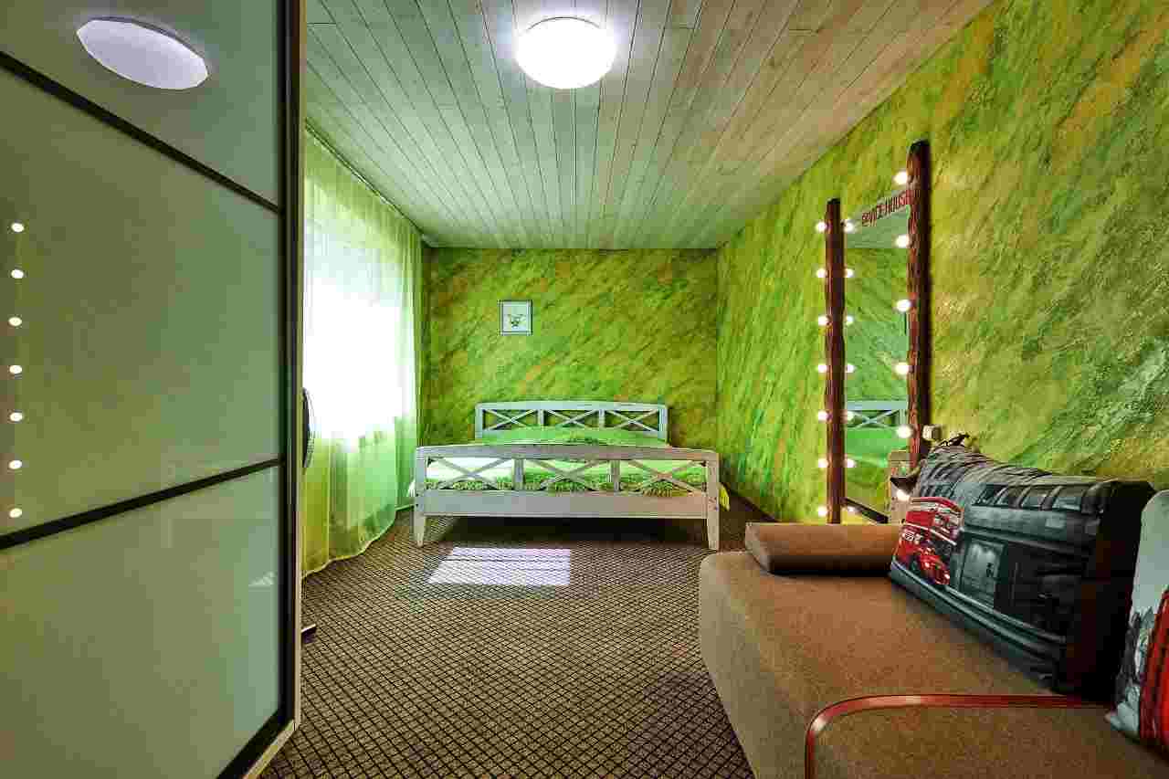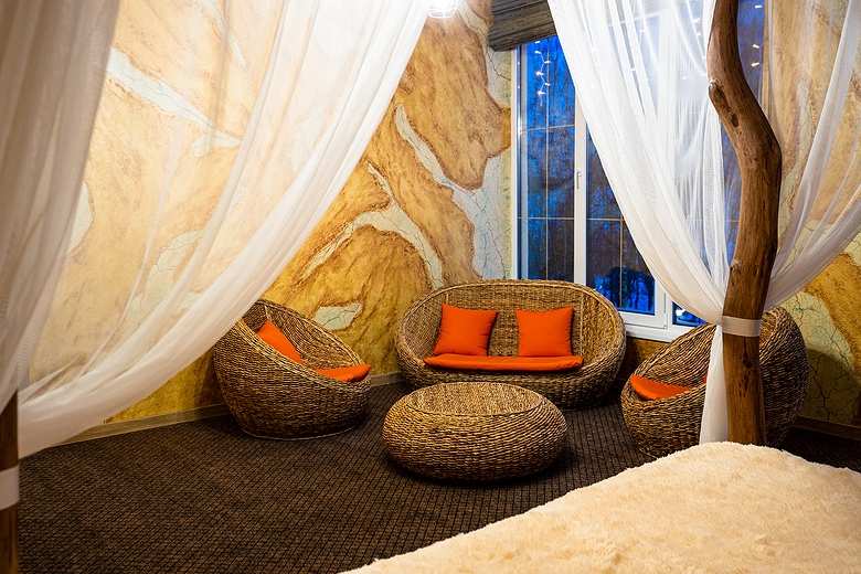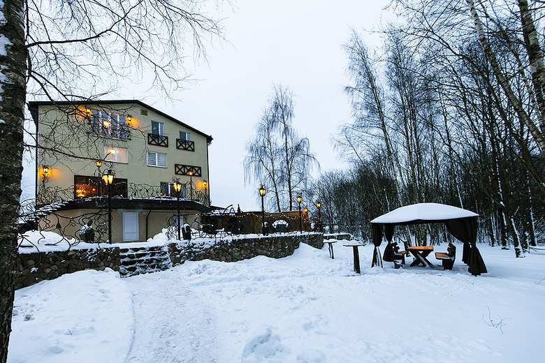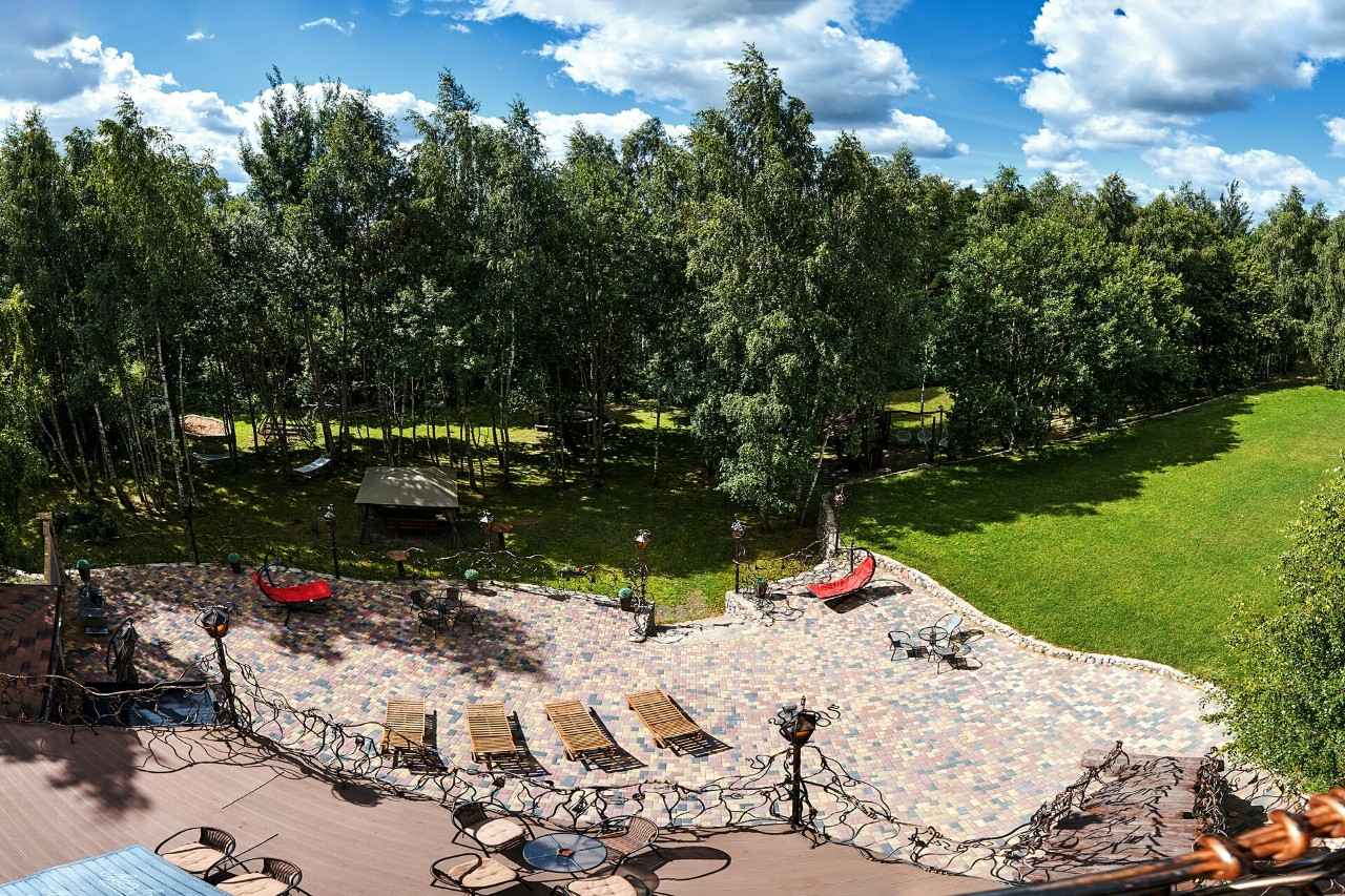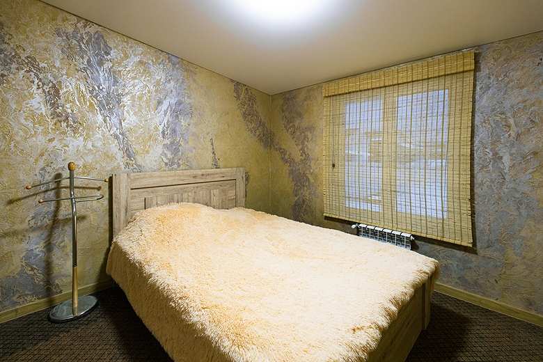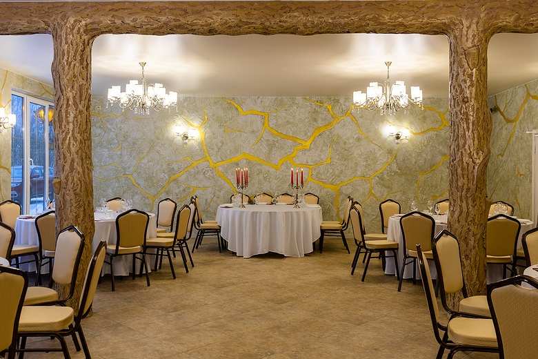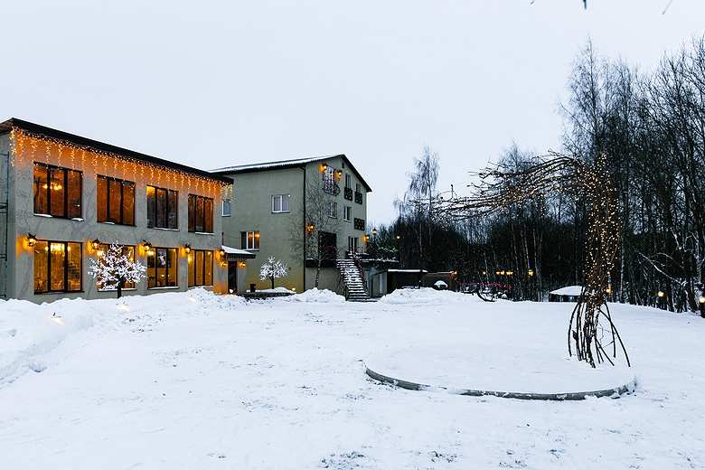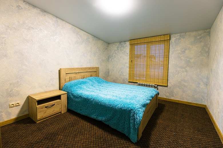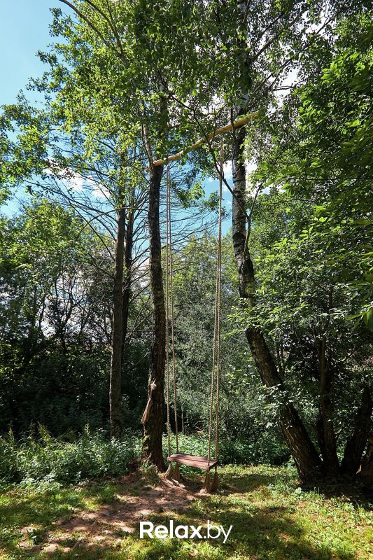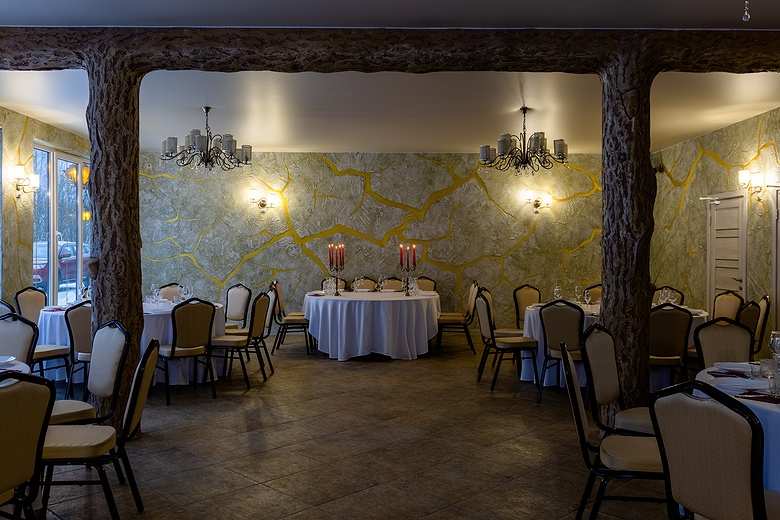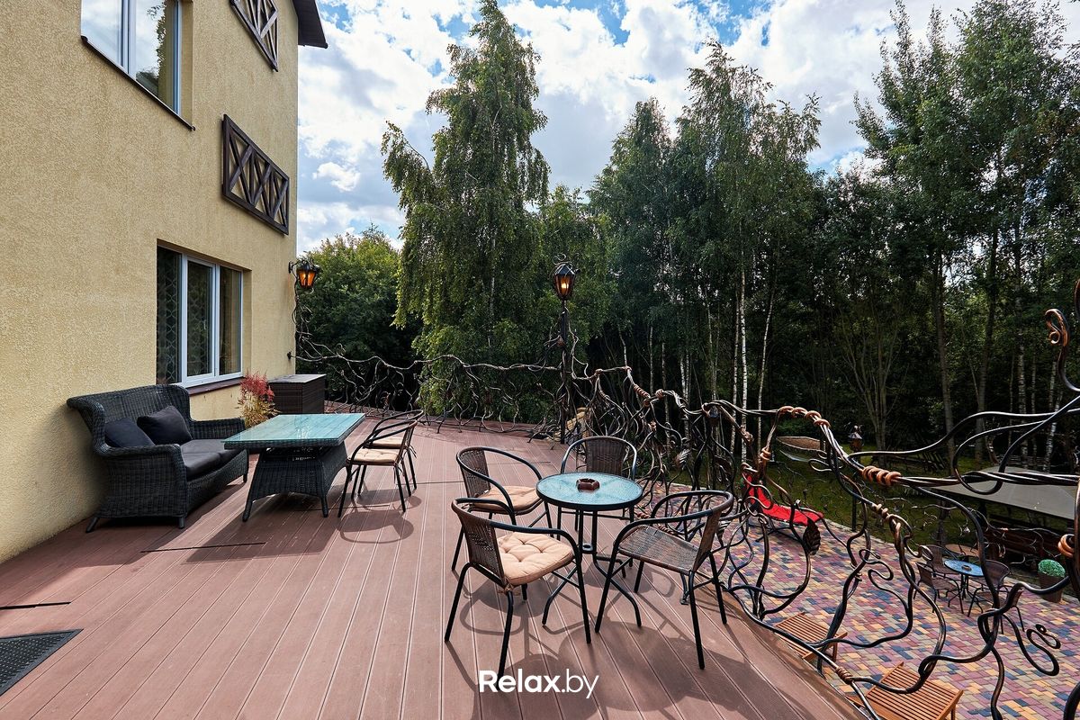 Внутри дома есть 5 комнаты отдыха с двуспальными кроватями и мебелью, чтобы комфортно разместиться на несколько дней. Только современная сантехника и бытовая техника кухни: все блага цивилизации доступны даже в загородной поездке. Из дома оборудован выход на террасу, которая легко превращается в дополнительное место для праздника. Тут можно оборудовать настоящий банкетный зал на свежем воздухе. Для мероприятий внутри дома предлагается 2 банкетных зала (20-50 чел.) с уникальными интерьерами.