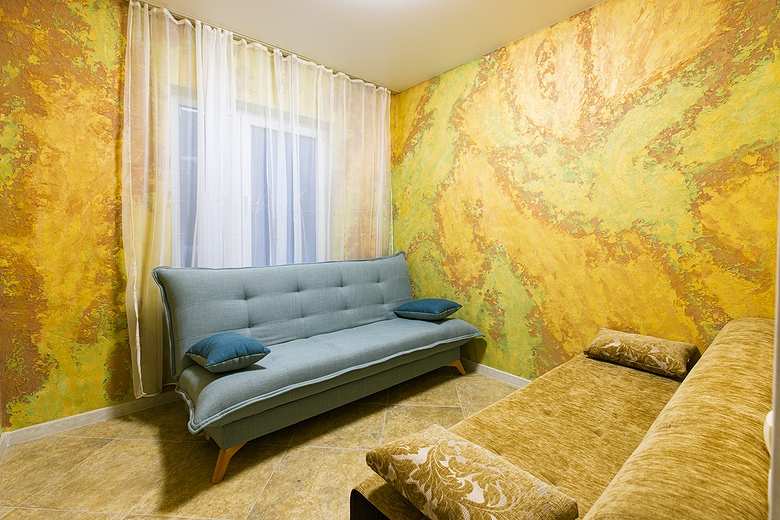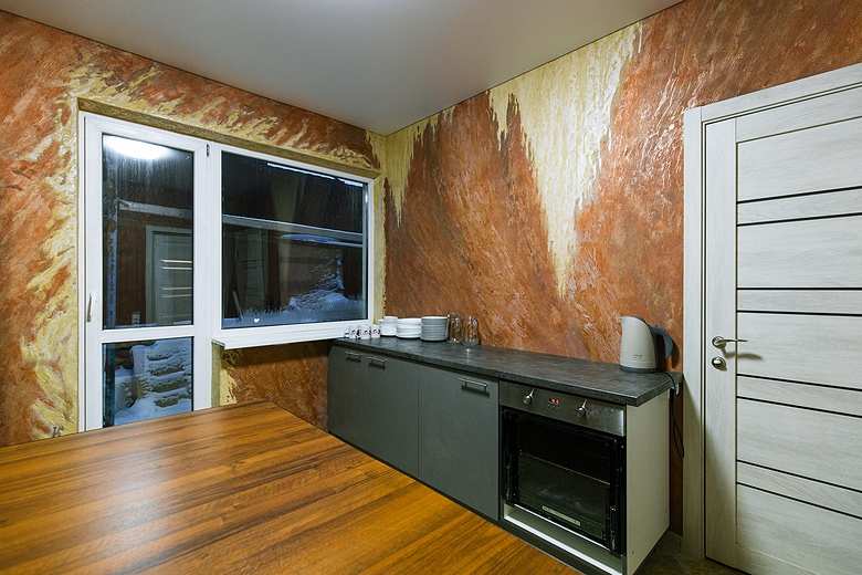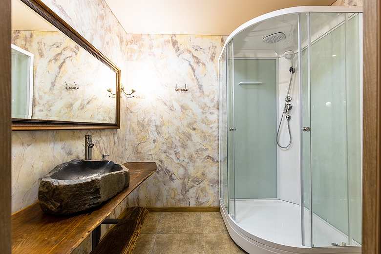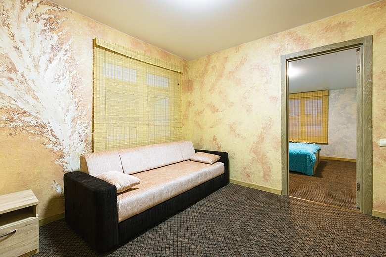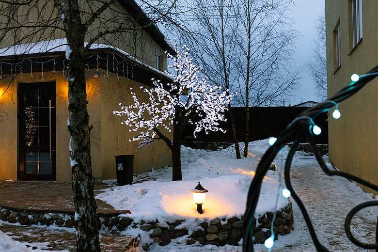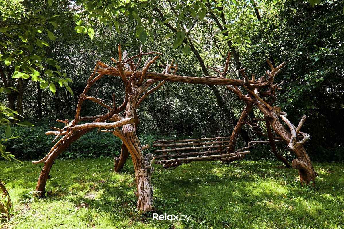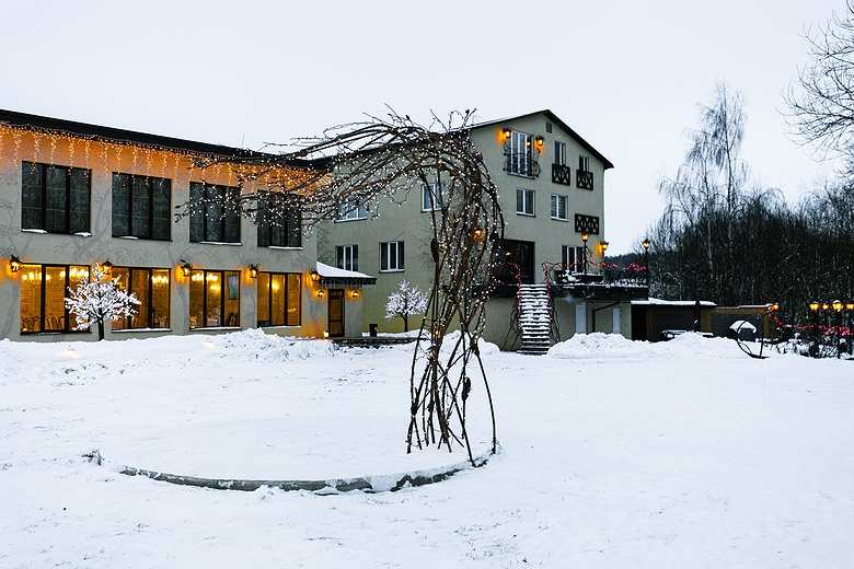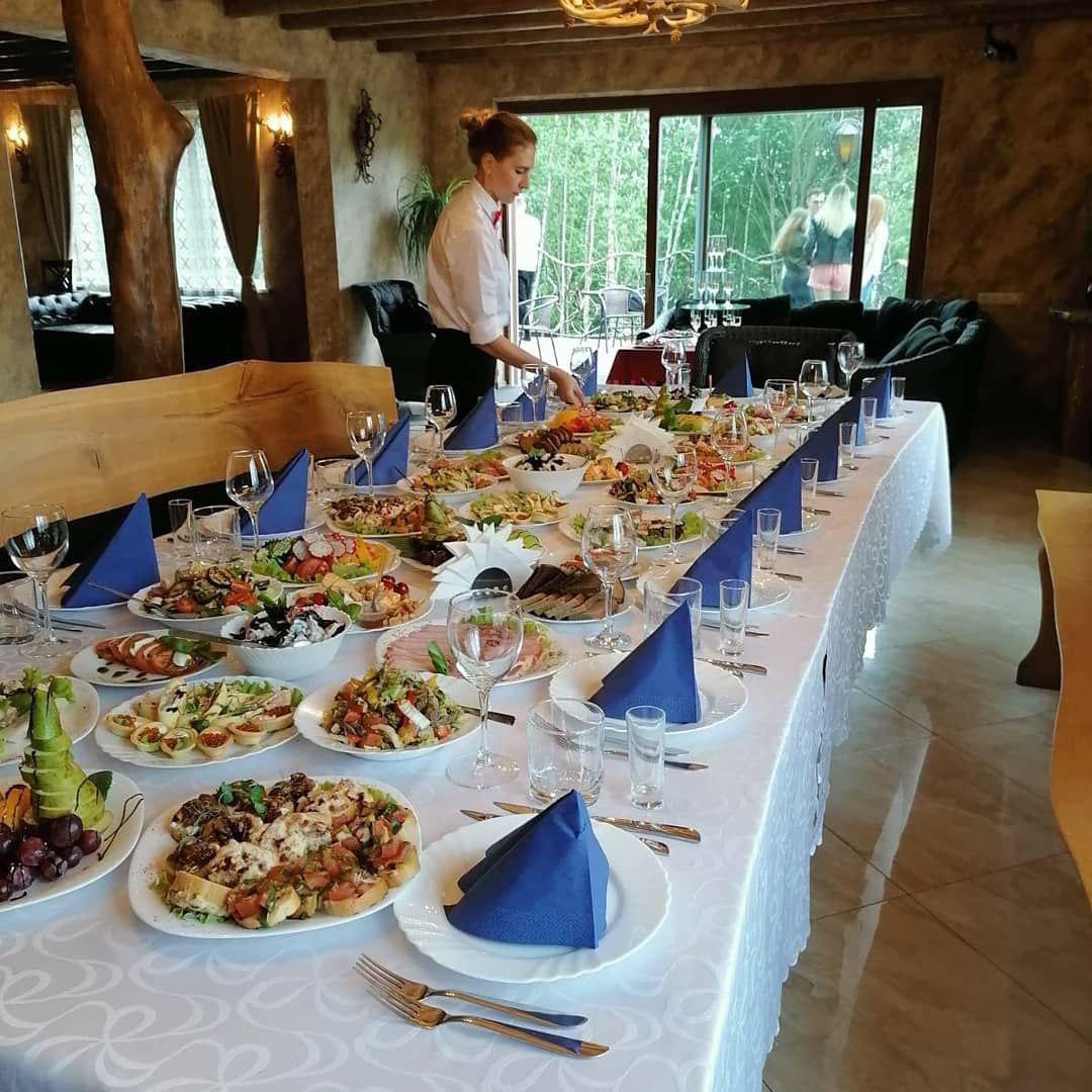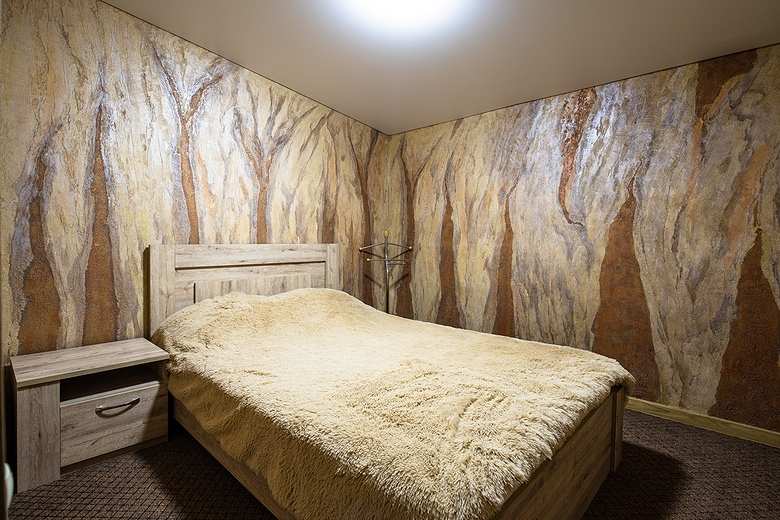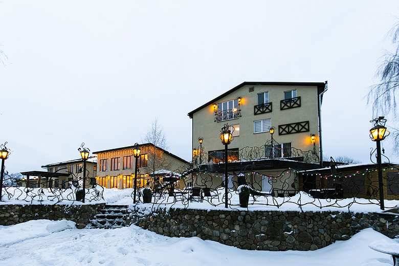 Внутри дома есть 5 комнаты отдыха с двуспальными кроватями и мебелью, чтобы комфортно разместиться на несколько дней. Только современная сантехника и бытовая техника кухни: все блага цивилизации доступны даже в загородной поездке. Из дома оборудован выход на террасу, которая легко превращается в дополнительное место для праздника. Тут можно оборудовать настоящий банкетный зал на свежем воздухе. Для мероприятий внутри дома предлагается 2 банкетных зала (20-50 чел.) с уникальными интерьерами.