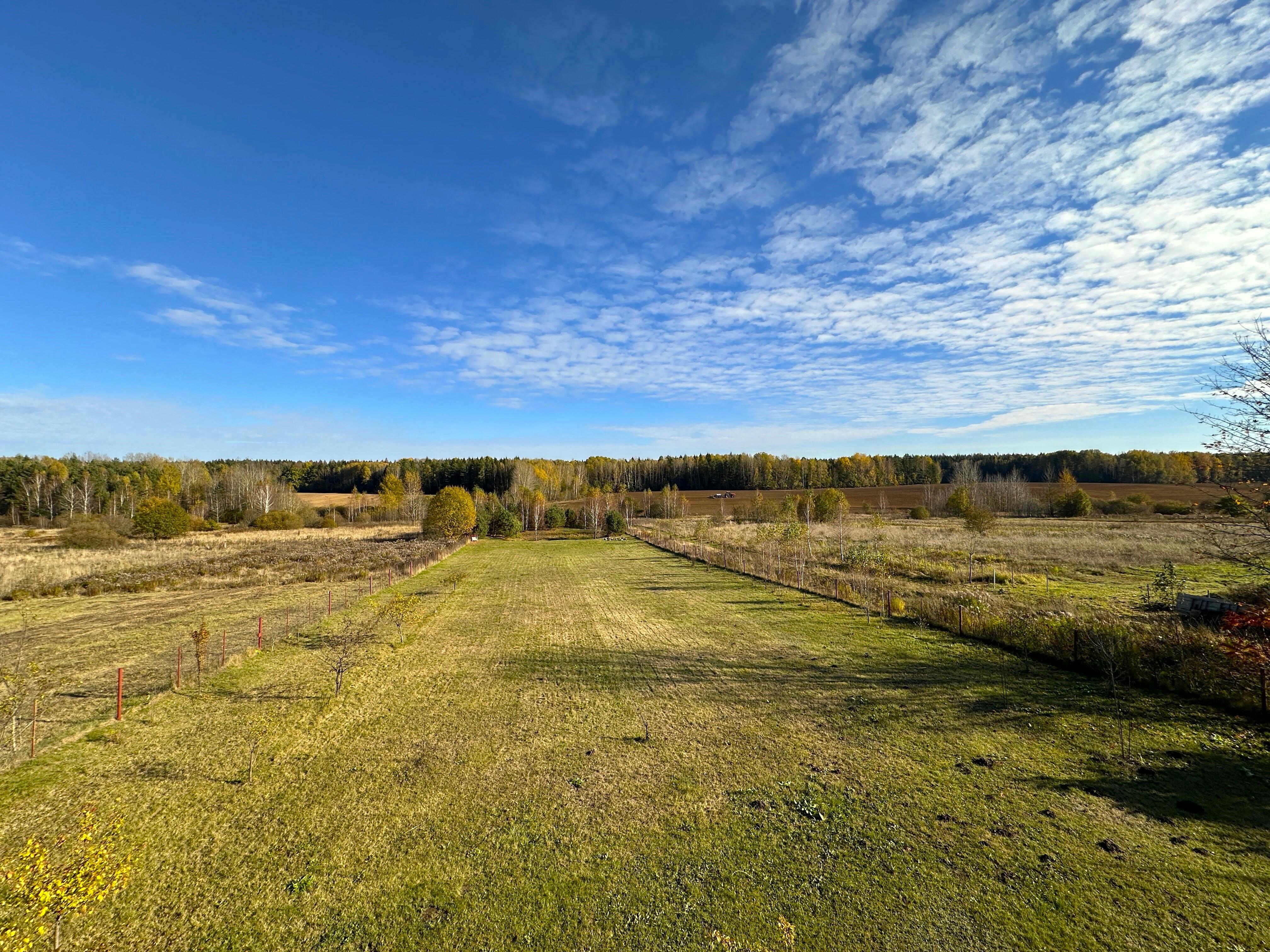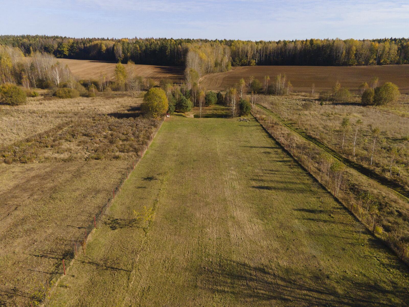 С одной стороны граничит с соседним заселенным участком, с другой пролегает проселочная дорога. Территория ровная, засеяна газонной травой.