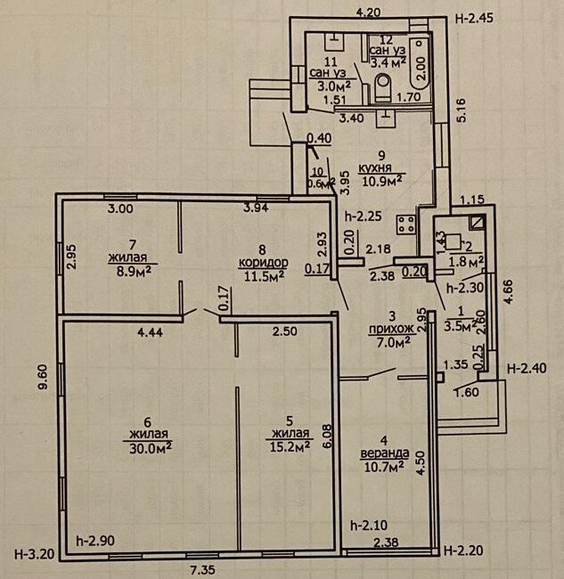 В доме три комнаты (30 кв.м, 15.2 кв.м и 9 кв.м), кухня (10,9 кв.м).
