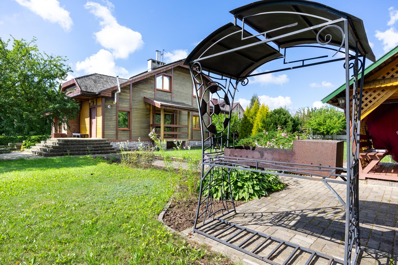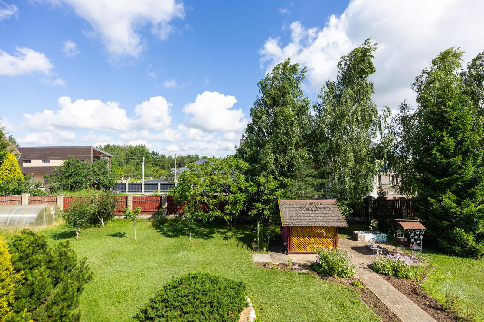 По периметру — взрослые туи, создающие приватность и уют. Газон. Плодоносящий сад, кустарники и декоративные растения.